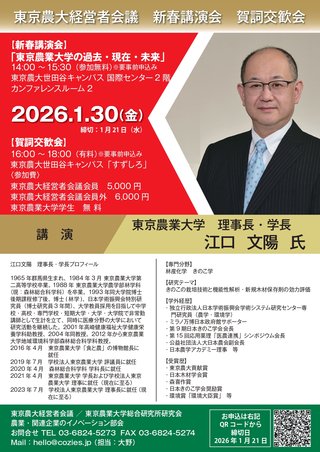 下記の通り新春講演会・賀詞交換会を開催いたします。ぜひお誘い合わせのうえ、ふるってご参加下さい。 【新春講演会】 講師:江口文陽氏(東京農業大学 理事長・学長) テーマ:「東京農業大学の過去・現在・未来」 日時 :令和8年1月30日(金) 14時~15時半 場所 :農大世田谷キャンパス 国際センター2階 カンファレンスルーム2 参加費:無料(要事前申し込み) 【賀詞交歓会】 日時 :令和8年1月30日(金) 16時~18時(予定) 場所 :東京農大 世田谷キャンパス 「すずしろ」 参加費(当日徴収・要事前申し込み) 東京農大経営者会議 会員 :5,000円 東京農大経営者会議 会員以外:6,000円 東京農業大学 学生 :無料 参加をご希望の方は以下フォームよりお申し込み下さい。 申込期限:1月21日(水) 参加フォームはこちら |